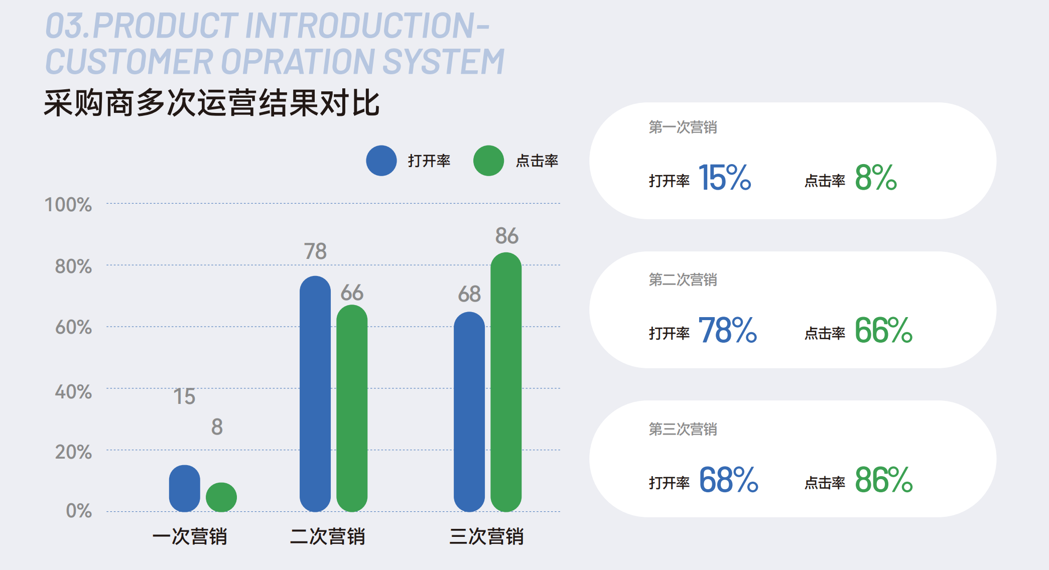 为什么要做客户运营?因为你一次邮件触达,你的潜在客户未必能给你回复。而那些未回复的客户,没到采购期的客户,正在关注和考察你的客户,才是我们开发的最优质资源。也正是这些客户,才是需要我们不断反复有计划性的去跟进。客户的一次、二次、三次触达,他们的行为状况如下: