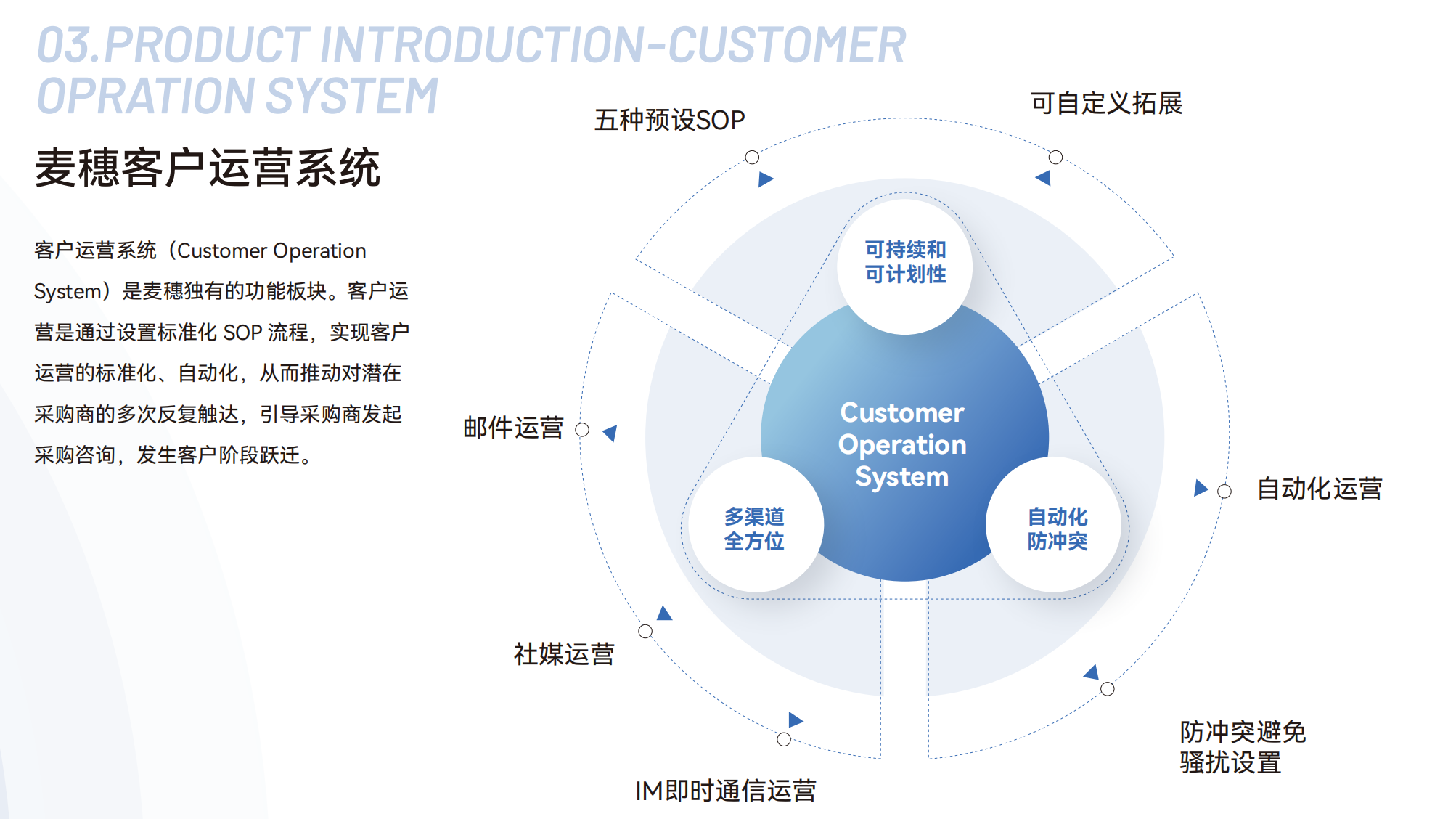 为此,麦穗专门开发了用于反复触达客户的客户运营系统(CUSTOMER OPRATION SYSTEM),帮助用户实现运营的SOP化和自动化,保证运营的可计划性和持久性。
